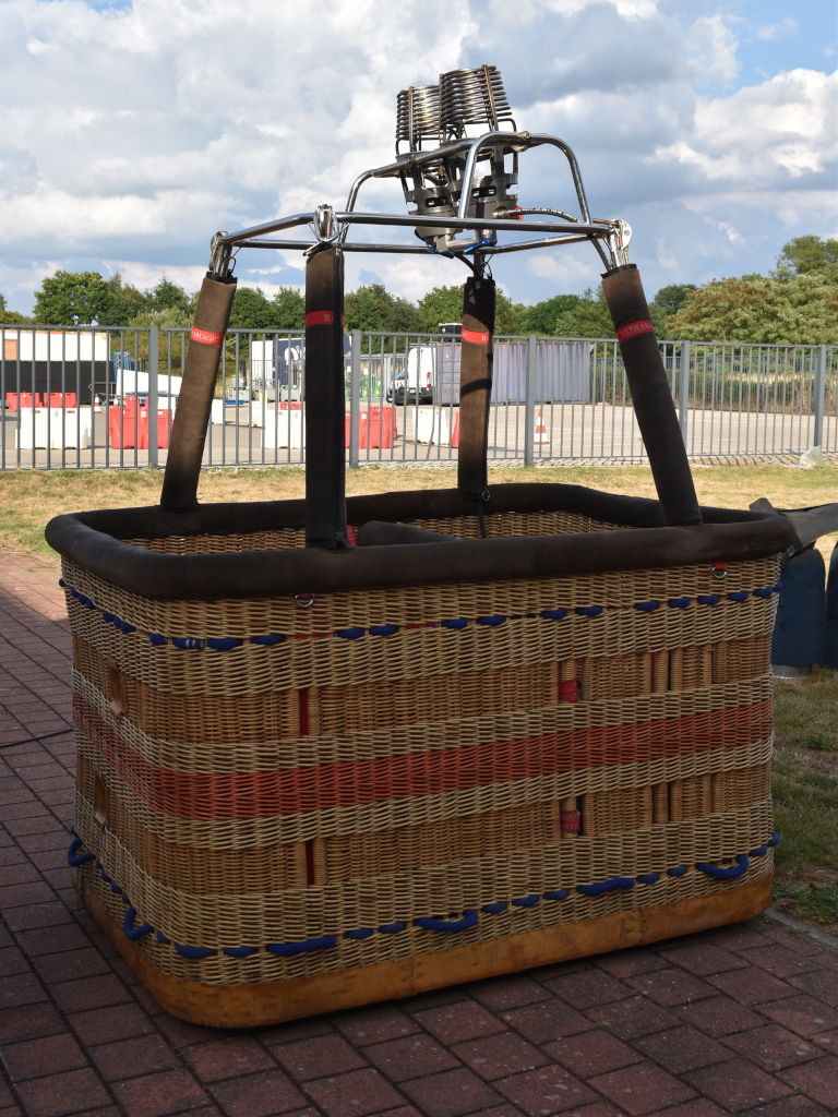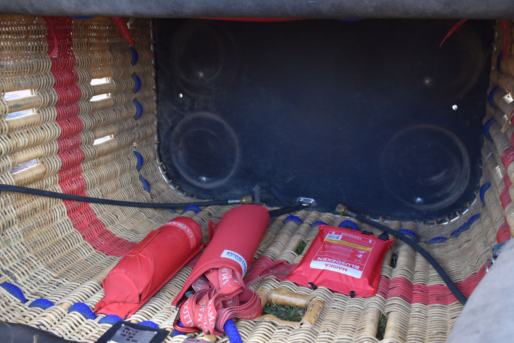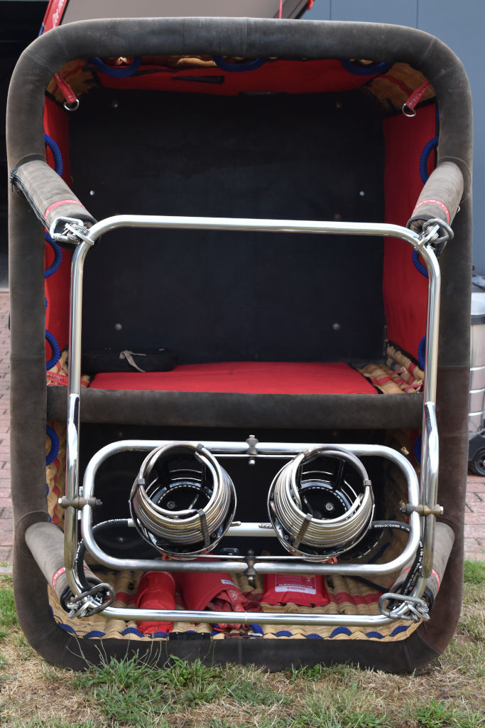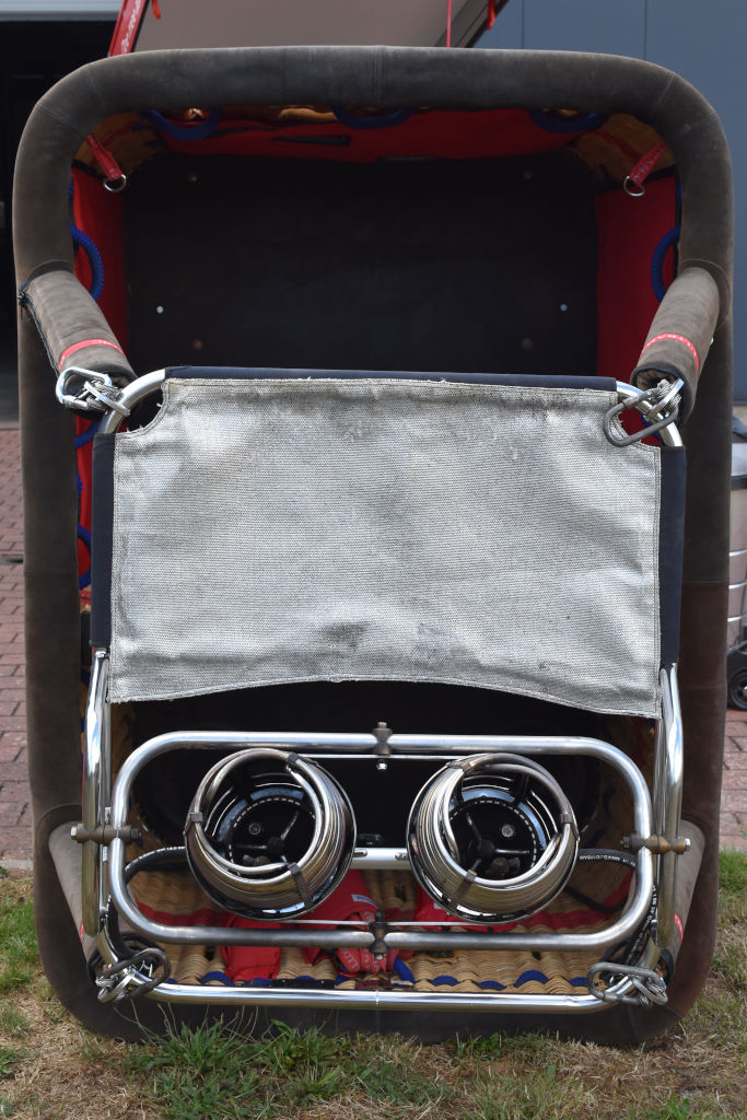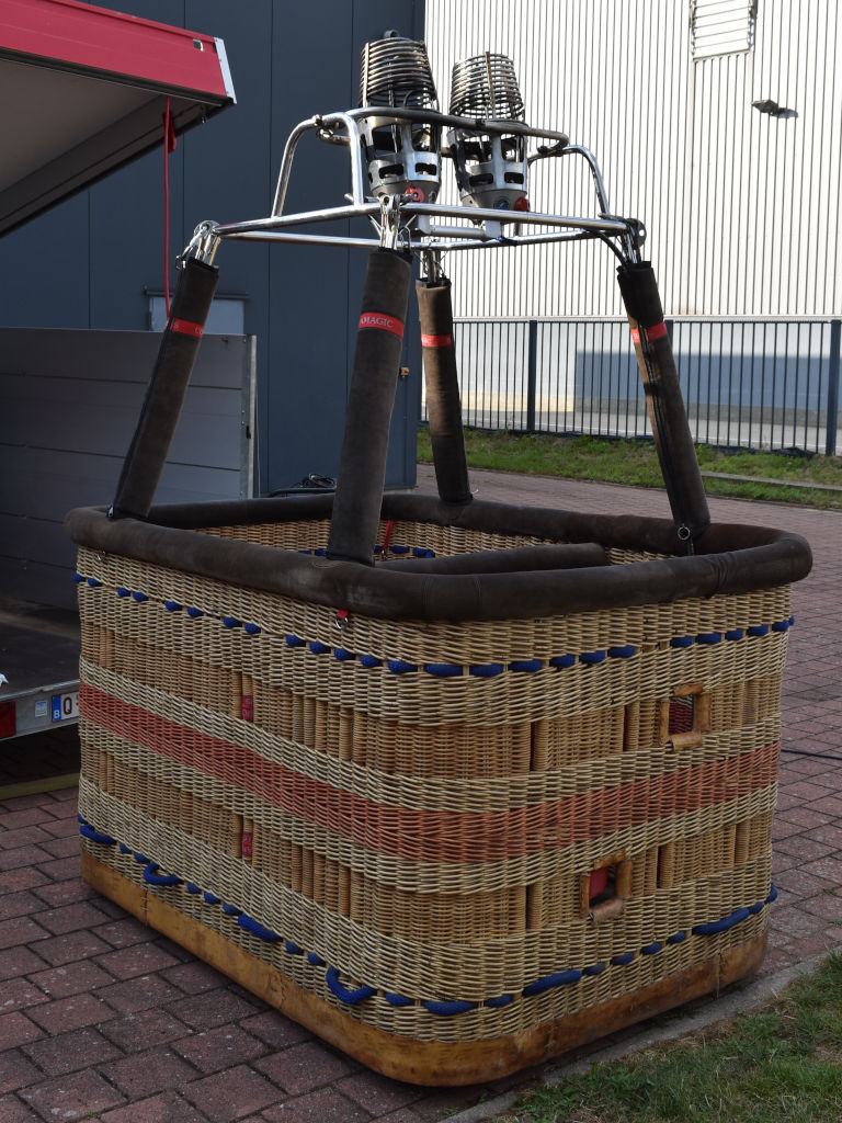 Ultramagic C6 basket, built 2002, inside dimensions 1.8m x 1.3m. Black suede top rim, sidewall padding, cushion floor, removable partition wall. Fire extinguisher, fire blanket, drop line, pilot restraint harness, 8 cylinder straps. Ultramagic MK21 double burner, built 2002, liquid pilot lights, REGO fittings, hoses dated 10/2017.