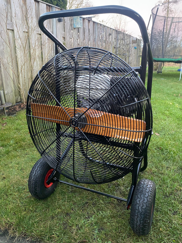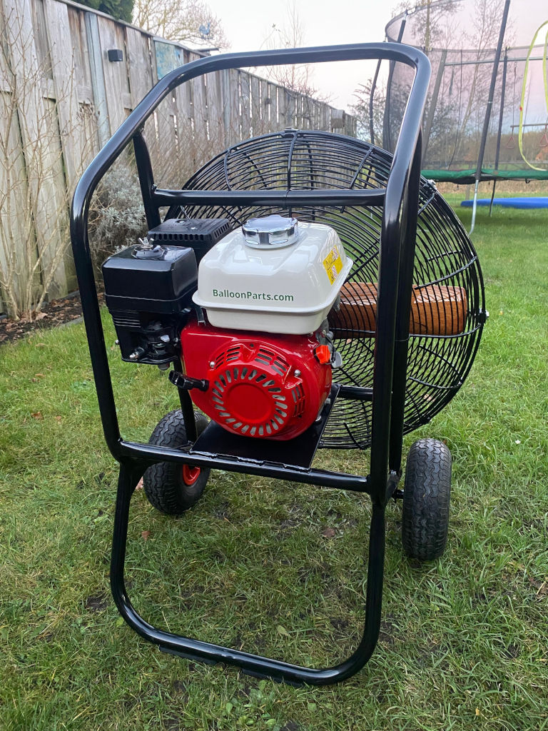 5.0 HP inflation fan, steel frame with fixed axle, wooden propeller. Recently serviced and refurbished: engine maintenance with new fuel tank, air filter, spark plug, oil. Frame and cage repaired and recoated, new rubber guard buffers fitted, propeller repainted, all fasteners replaced. In very good condition.